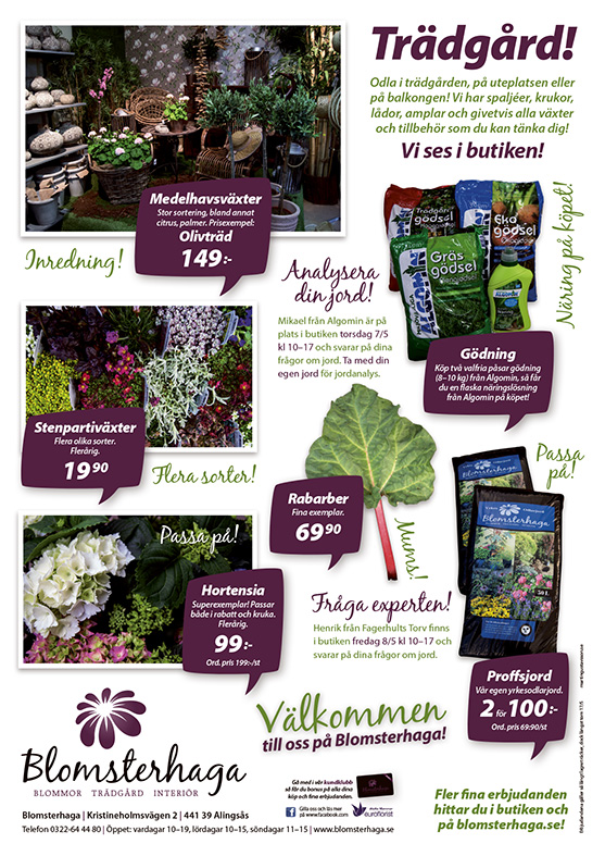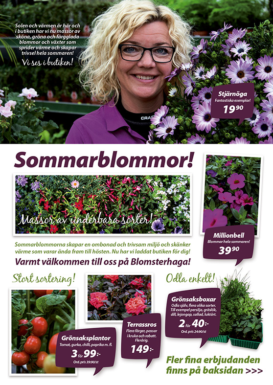 Nu tittar solen äntligen fram igen och sommaren är tillbaka hos oss igen! För gott får vi verkligen hoppas. Vi har i alla fall laddat butiken för sommaren och har just nu stor sortering av härliga sommarblommor, växter, buskar, träd och tillbehör som skänker värme och härliga färger till ditt hem, dina planteringar och din trädgård. Kom till butiken och låt dig inspireras, våra duktiga florister hjälper dig gärna! Vi önskar er alla en riktigt trevlig sommar!